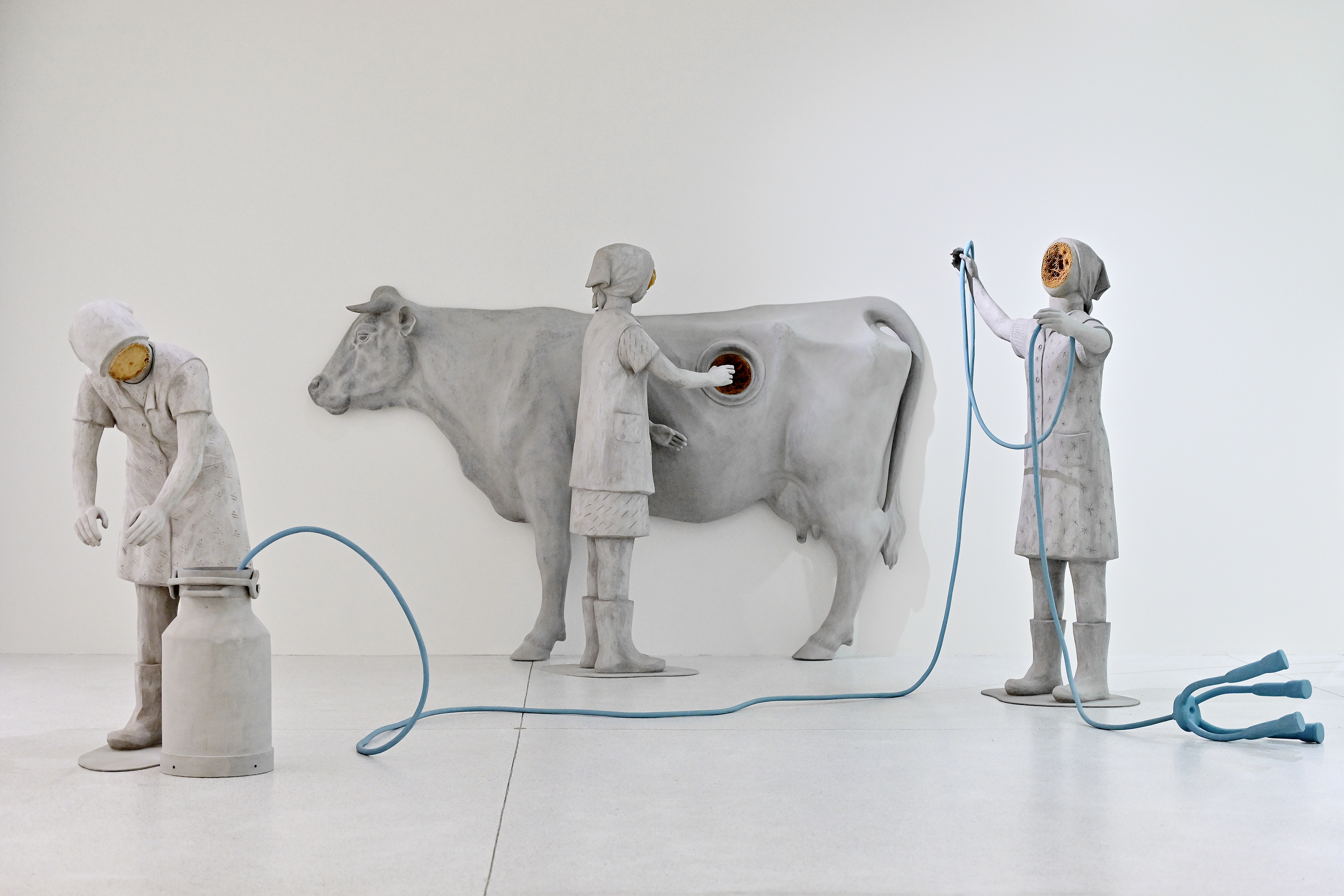 The work of Anna Hulačová (b. 1984, Sušice, Czech Republic) is ingrained deeply in the medium of sculpture. Exploring through a wide range of traditional sculptural techniques, the intricate set of relations between the animate and the digital, evolution and mutation, the local and the global, utopia and dystopia, Hulačová forms a distinct artistic language, characteristic for its formal and thematic richness, associative symbolism, and formal ties with the past. By combining brutalist features such as concrete, a central material of the work with organic forms, Hulačová points to our time’s hybrid nature, where seemingly distant or even opposed forms merge and mutate into a new reality. The greyness of the material heightens the apocalyptic nature of the work, initiating a play of the haptic, where the hard and the soft, the dry and the wet, the smooth and the rough, become a reminder that materiality, physical experience and encounter, have yet not been rendered obsolete.
